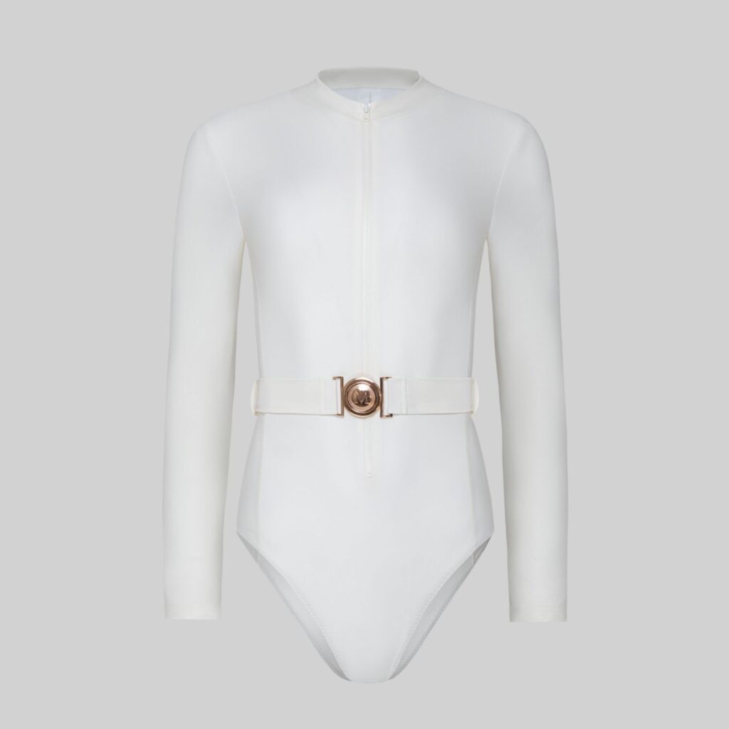 One-piece  ivory swimsuit with belt and buckle, long sleeves, stand-up neckline and zip at front. Model size: EU 36