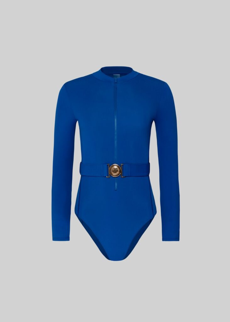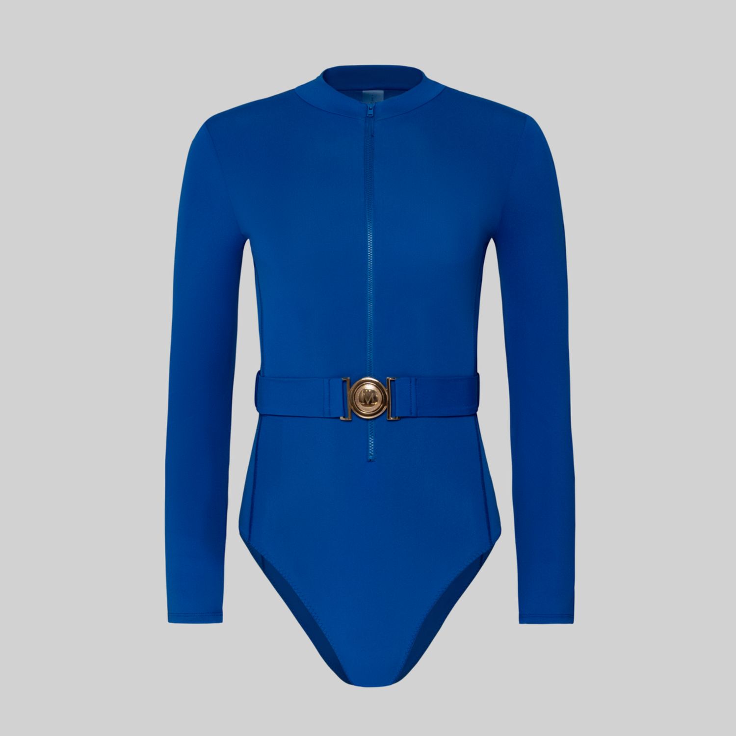 One-piece deep blue  swimsuit with belt and buckle, long sleeves, stand-up neckline and zip at front. Model size: EU 36