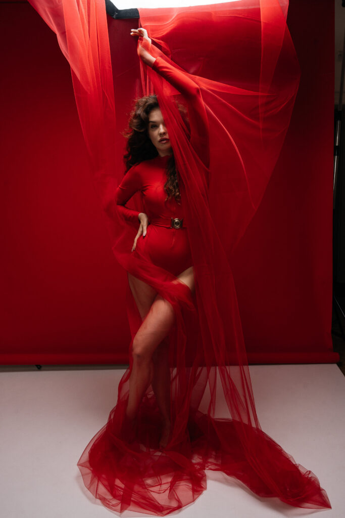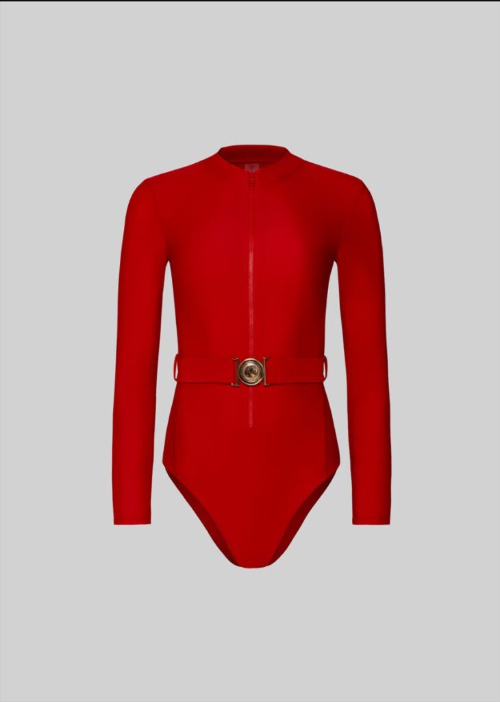 One-piece red swimsuit with belt and buckle, long sleeves, stand-up neckline and zip at front. Model size: EU 36